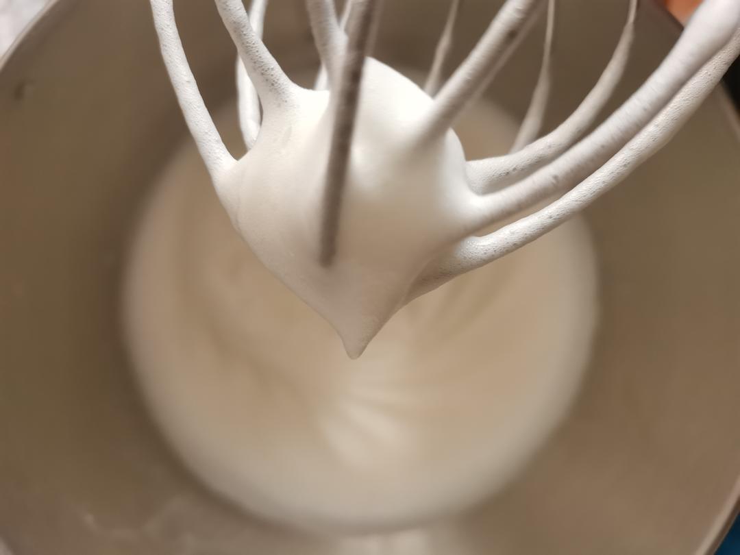 打发蛋清,先讲柠檬汁挤入蛋清,打发至粗泡,分三次加入白砂糖,打发至小弯钩状态