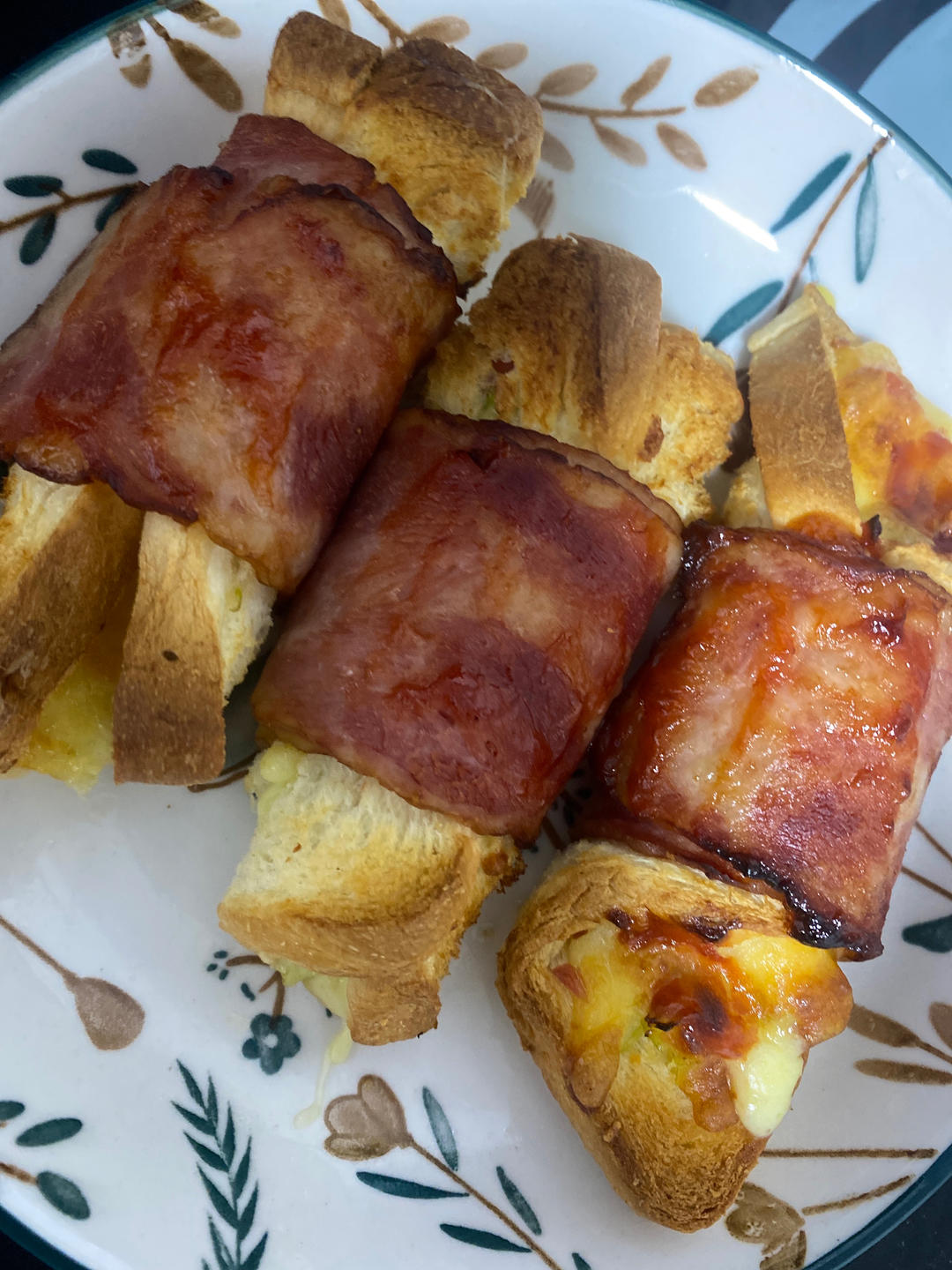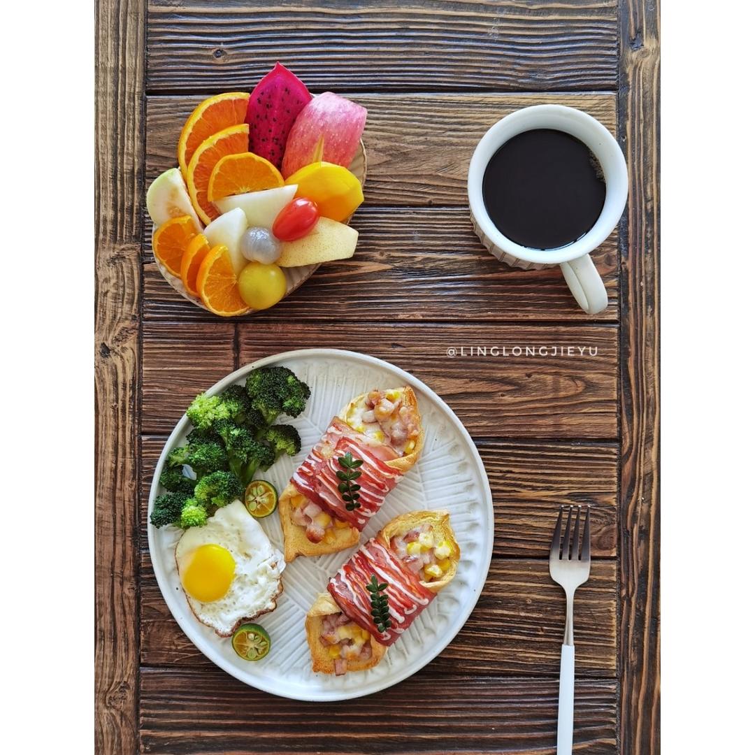 芝士培根吐司卷,煎蛋,西兰花,水果,黑咖☕️