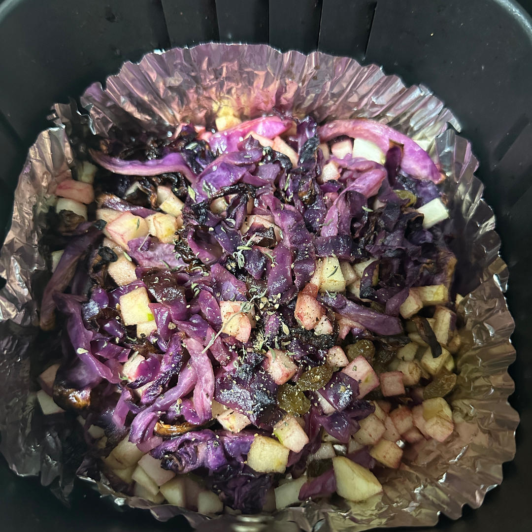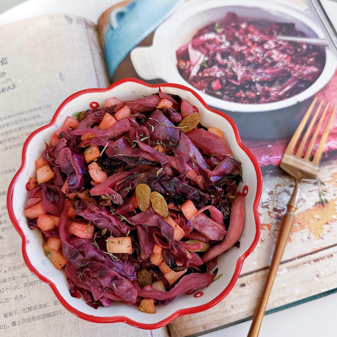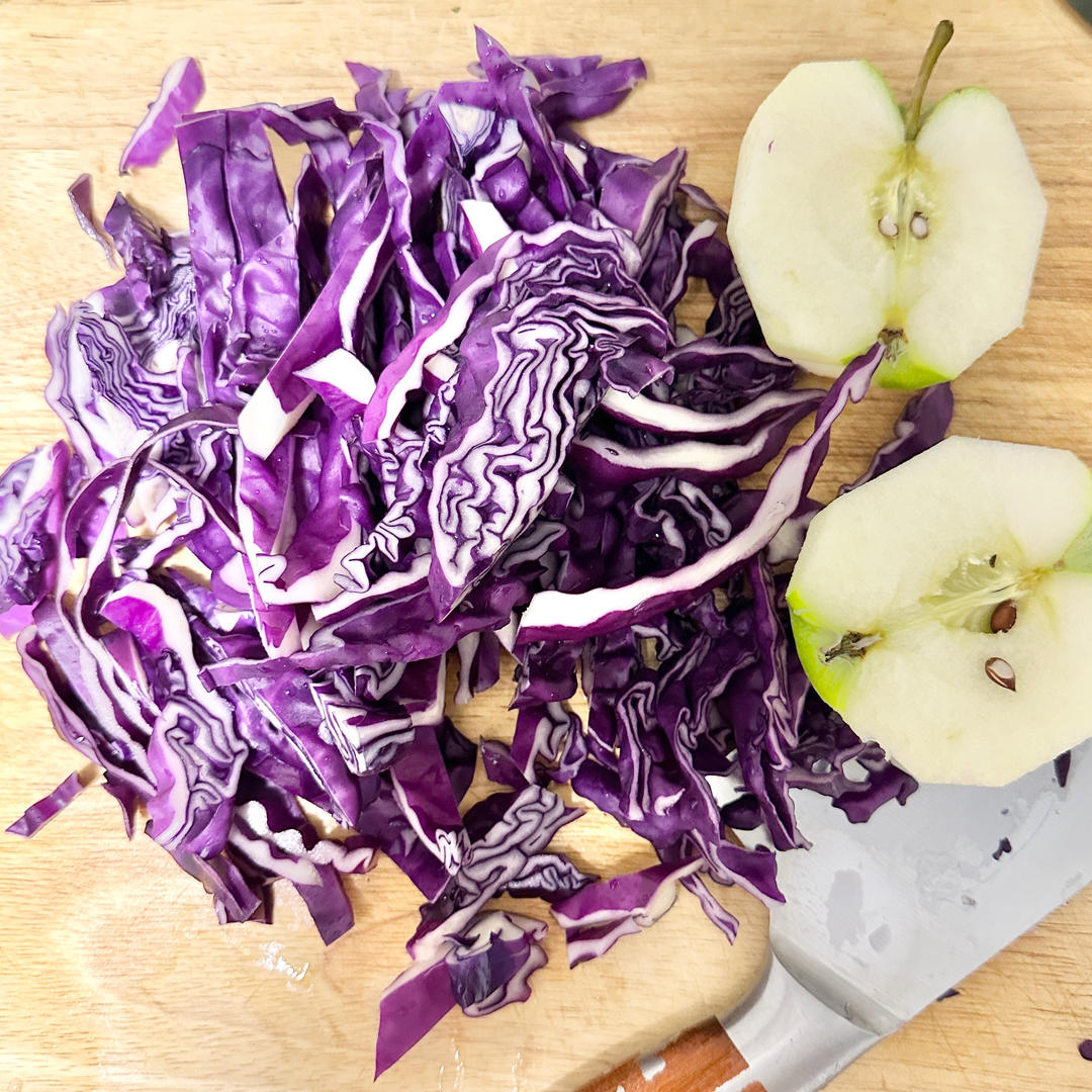 紫甘蓝去心,叶子切细丝;青苹果去皮,去核,碾碎备用;