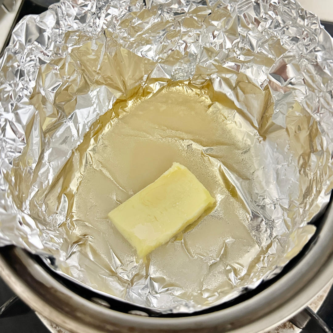 把黄油、糖、醋、盐、水放入带盖的明火用烤盘中,中火加热直至黄油融化并且所有的材料融合在一起; (我没有明火用的烤盘,用锡纸裹在了锅里)