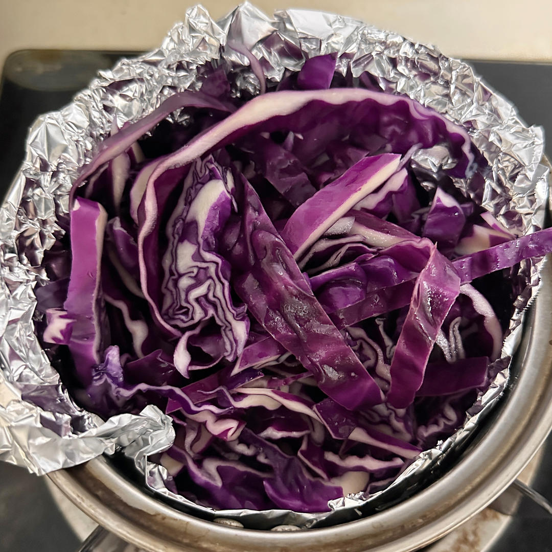 加入紫甘蓝翻拌均匀,煮开;