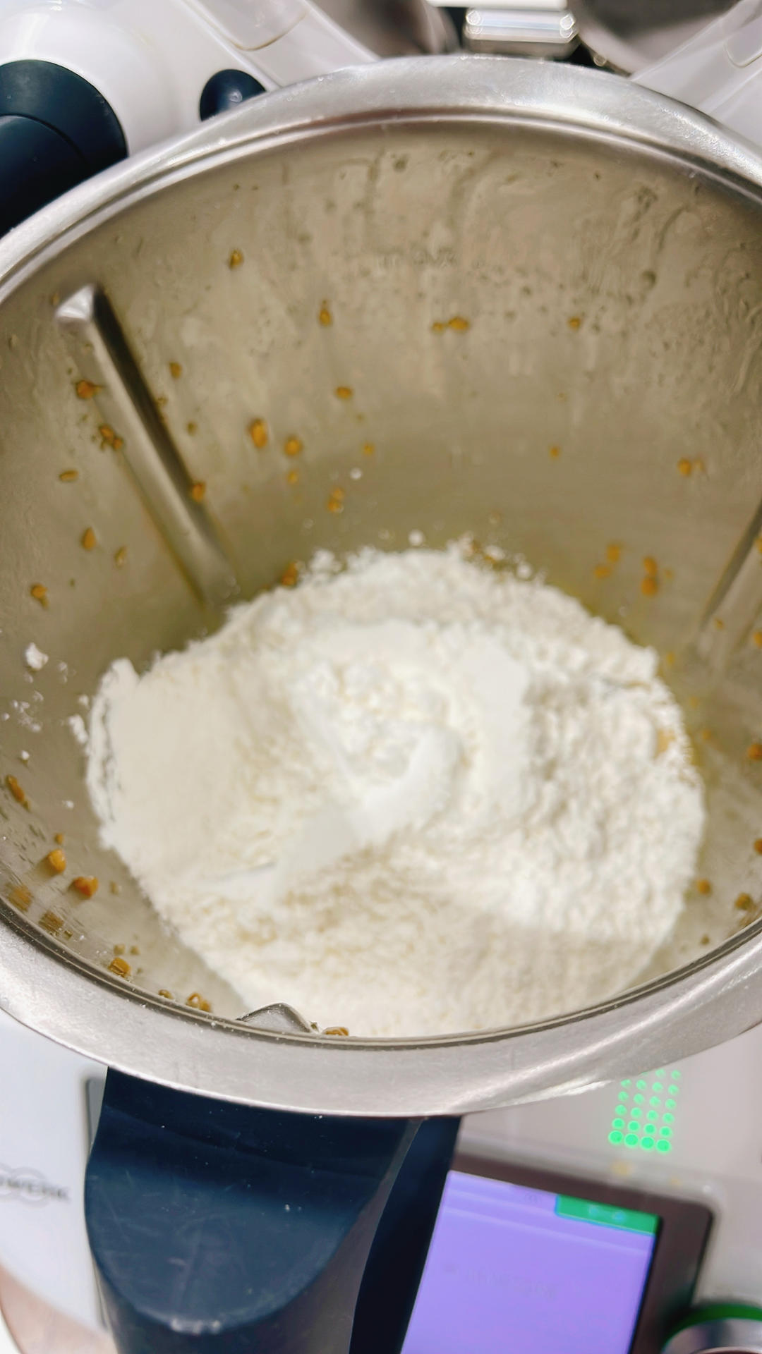 将70克黄油放入主锅,以30 秒/速度 3混合,利用刮刀棒將材料刮至主鍋底,再以30 秒/速度 3混合。 加入30克蛋液,以40 秒/速度 4混合
