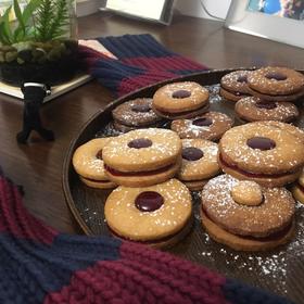 林茨饼干,这饼干简直酥成渣渣,出炉的瞬间撞一下烤盘碎了两块,夹果酱的时候轻轻一按酥掉三块…咬一口觉得整个人马上要变成渣了……好难烤,还剩一大块面团没做完好心塞 #漾漾的厨房#