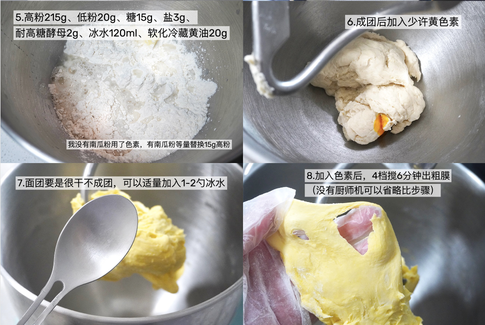碱水包面团除了烘焙碱的所有食材混合均匀,色素不是必须的。没有厨师机有手动把面团揉光滑即可。