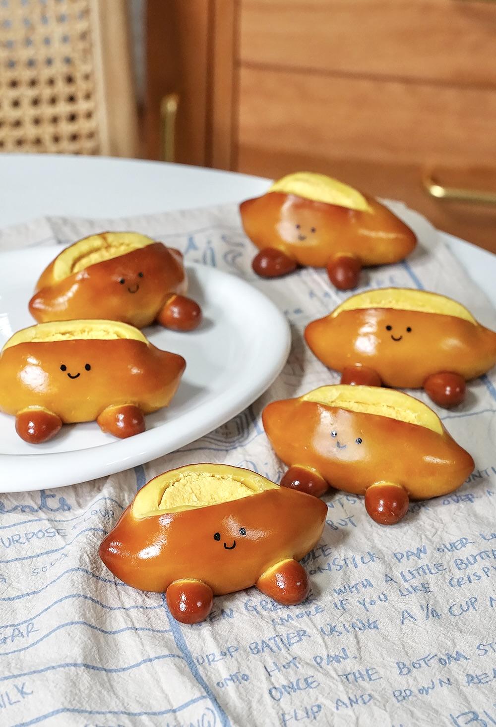 柠檬包用厨房用纸擦净水分,割出一条长口。 放入170预热好的烤箱中层,170度上下火烤20分钟,10分钟左右加盖锡纸。 拿出烤箱立即刷上一层薄薄的纯牛奶,这样碱水包才能有水光肌。冷却后用食用色素画上眼睛嘴巴就好啦~