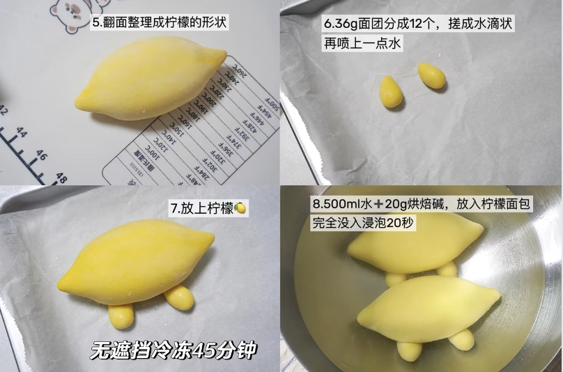 饺子🥟翻过来,捏成柠檬🍋状。之前的36g面团分成12个,先搓圆再搓成水滴💧状。 新手操作比较慢的画,就把其余的面团放冰箱冷藏,只有塑形的面团才室温操作,不然面团发酵了,做出来就不好看了。 腿腿刷上一层水,放上柠檬,无覆盖放冰箱冷冻45分钟。 500ml常温水+20g烘焙碱混合均匀,每个柠檬包都浸泡20秒,要完全淹没哈。