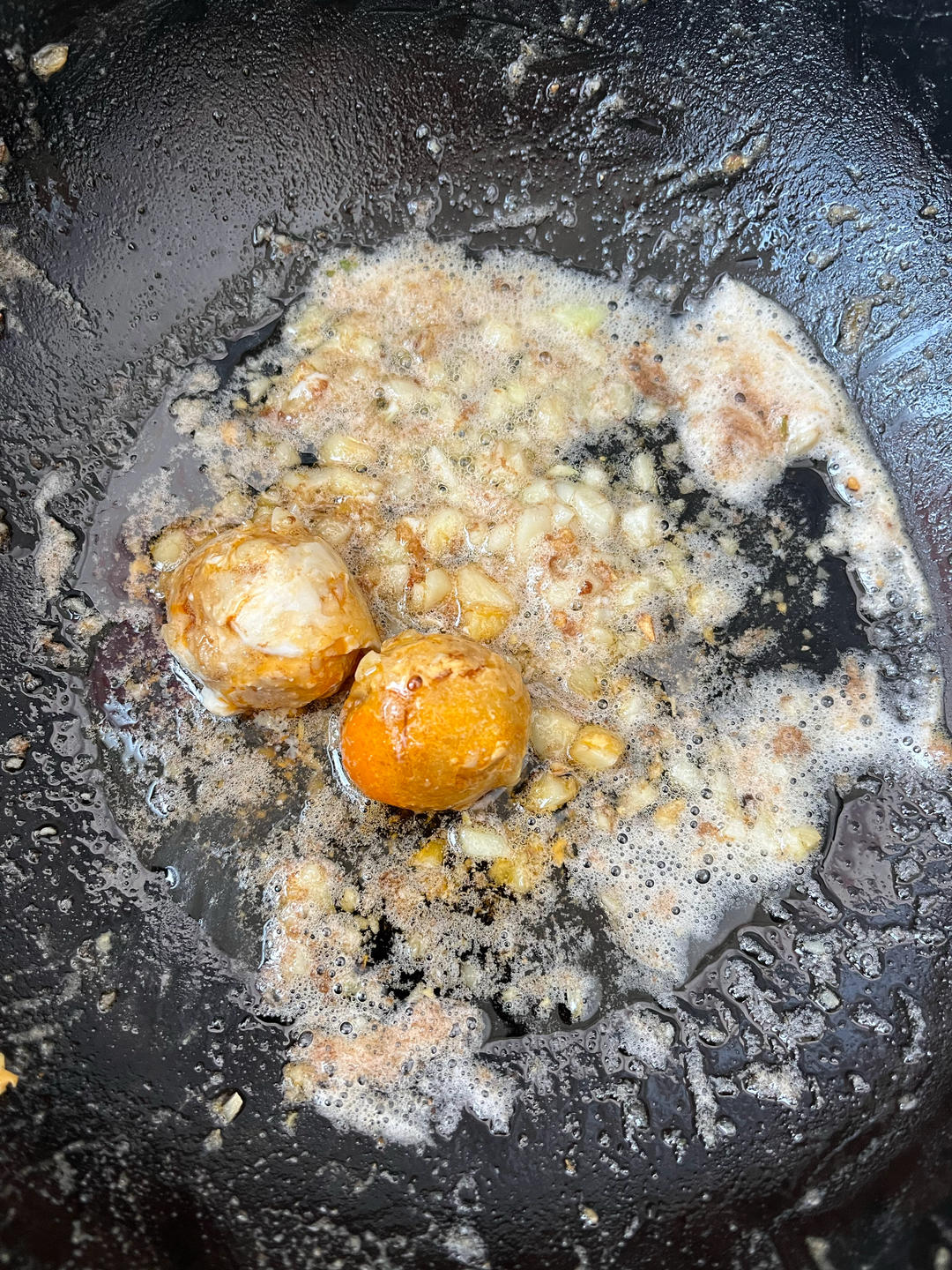 锅中放入油 蒜末 咸鸭蛋黄,一起炒香香
