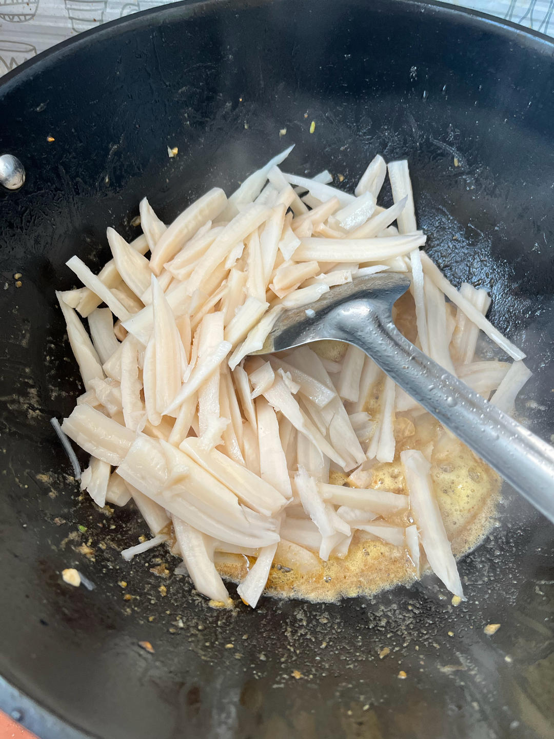 翻炒5-6下,蛋黄蒜末都裹在藕条儿上即可出锅食用了。