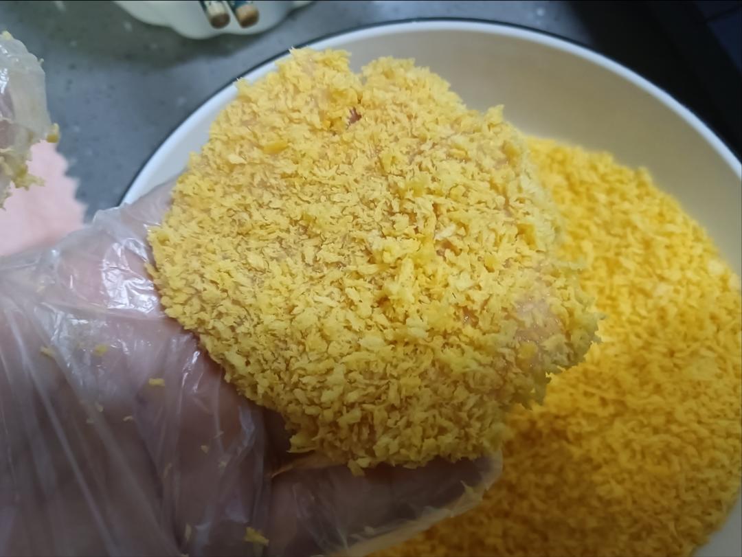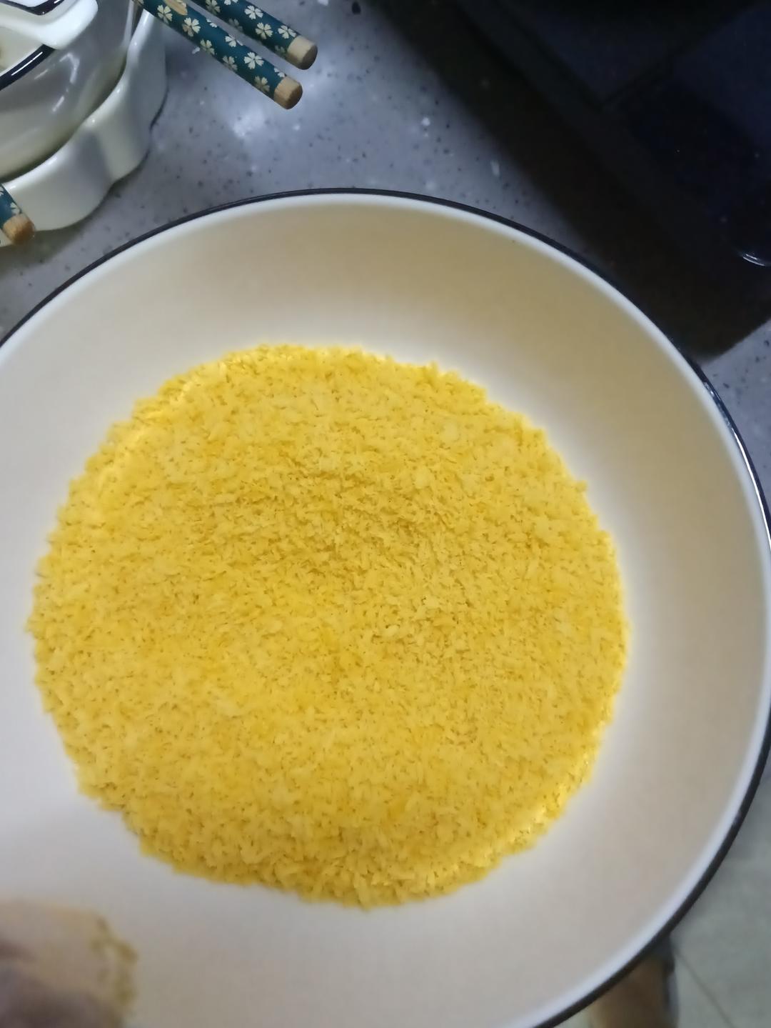 找一个更大的碗,放入面包糠,这个碗尽量大一点,我用了家里的大汤碗,因为裹面包糠要往上摁一摁,碗口太浅面包糠很容易溢出去