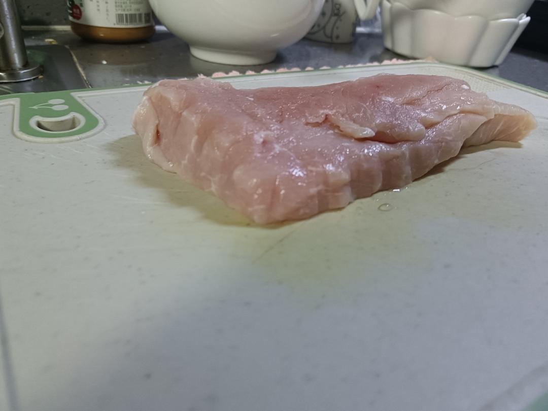 大概300g的一块猪里脊肉,新鲜的可以直接切,如果是冷冻的,那解冻的时候推荐泡水解冻,这样口感更好一点 因为比较薄,所以我们切的时候斜着下刀,这样片出来比较大张,也比较薄,炸的时候比较好熟