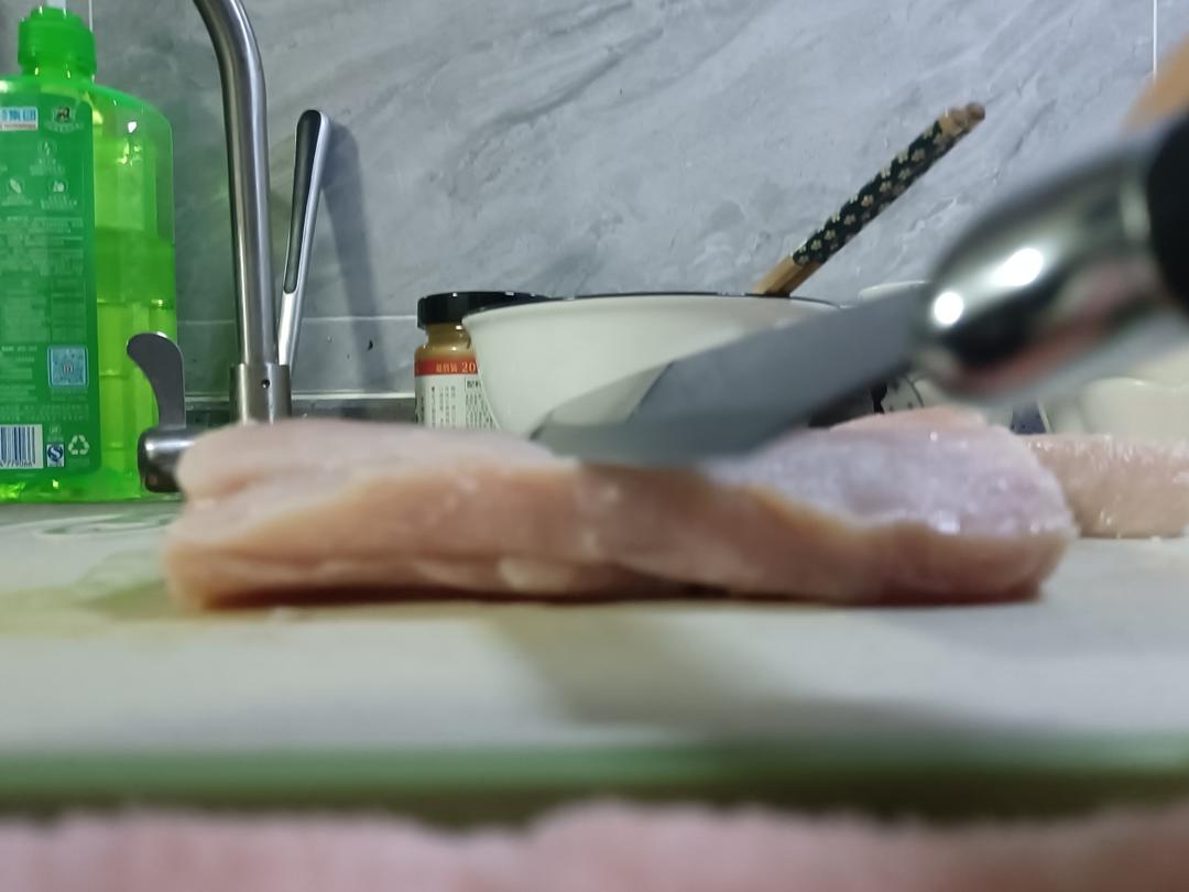 片好之后就是这样的,之后用松肉锤或者菜刀刀背敲打两面,敲断肉筋松软肉质。