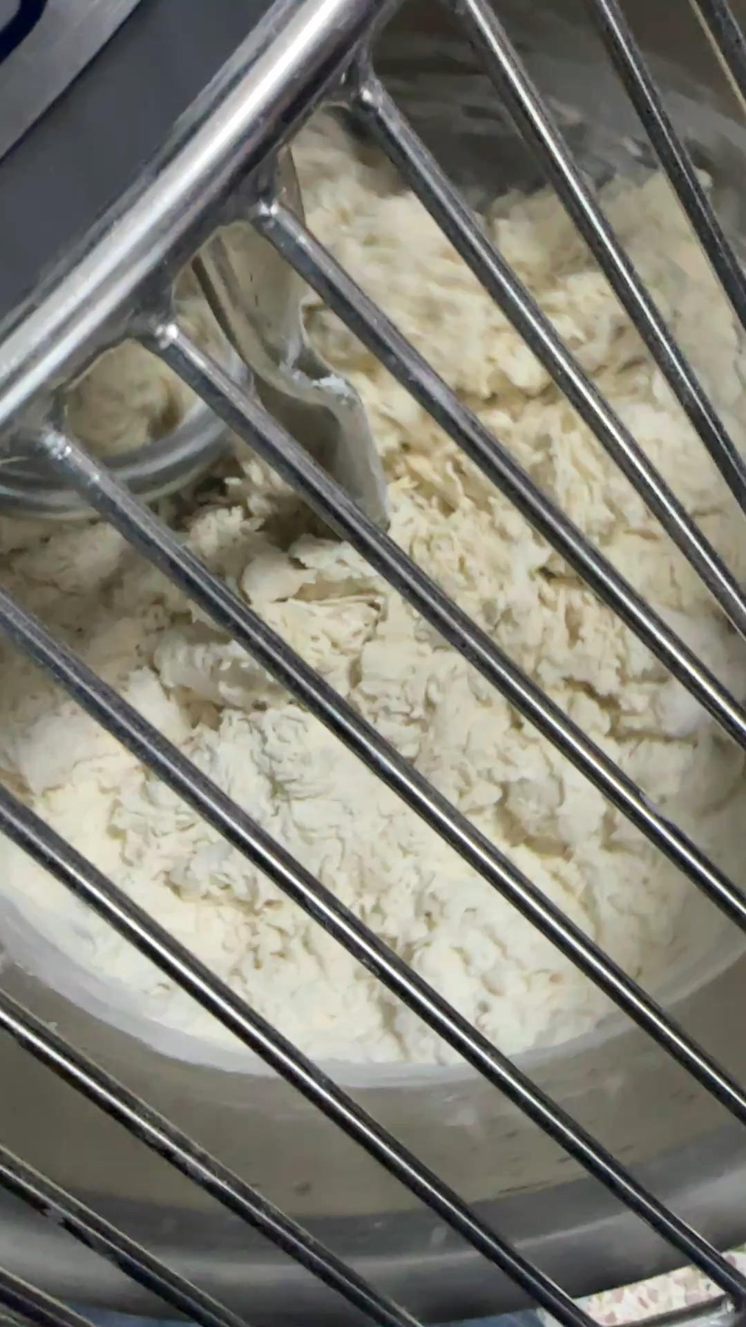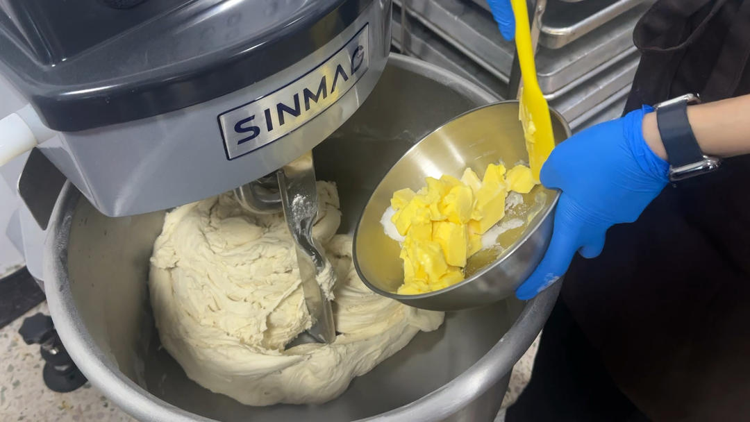 放入黄油和盐,慢速搅拌约2分钟,让黄油和面团充分混合