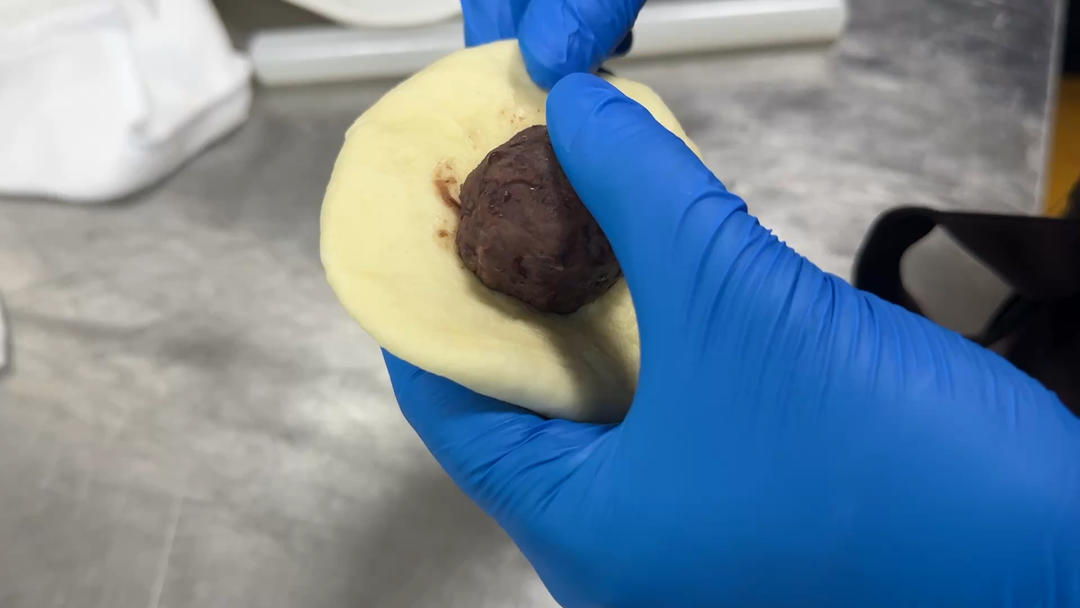 松弛好的面团擀成圆形,光面朝下,用包包子的手法包入红豆馅料,收紧口,收口朝下放入烤盘,用手掌心轻轻压,