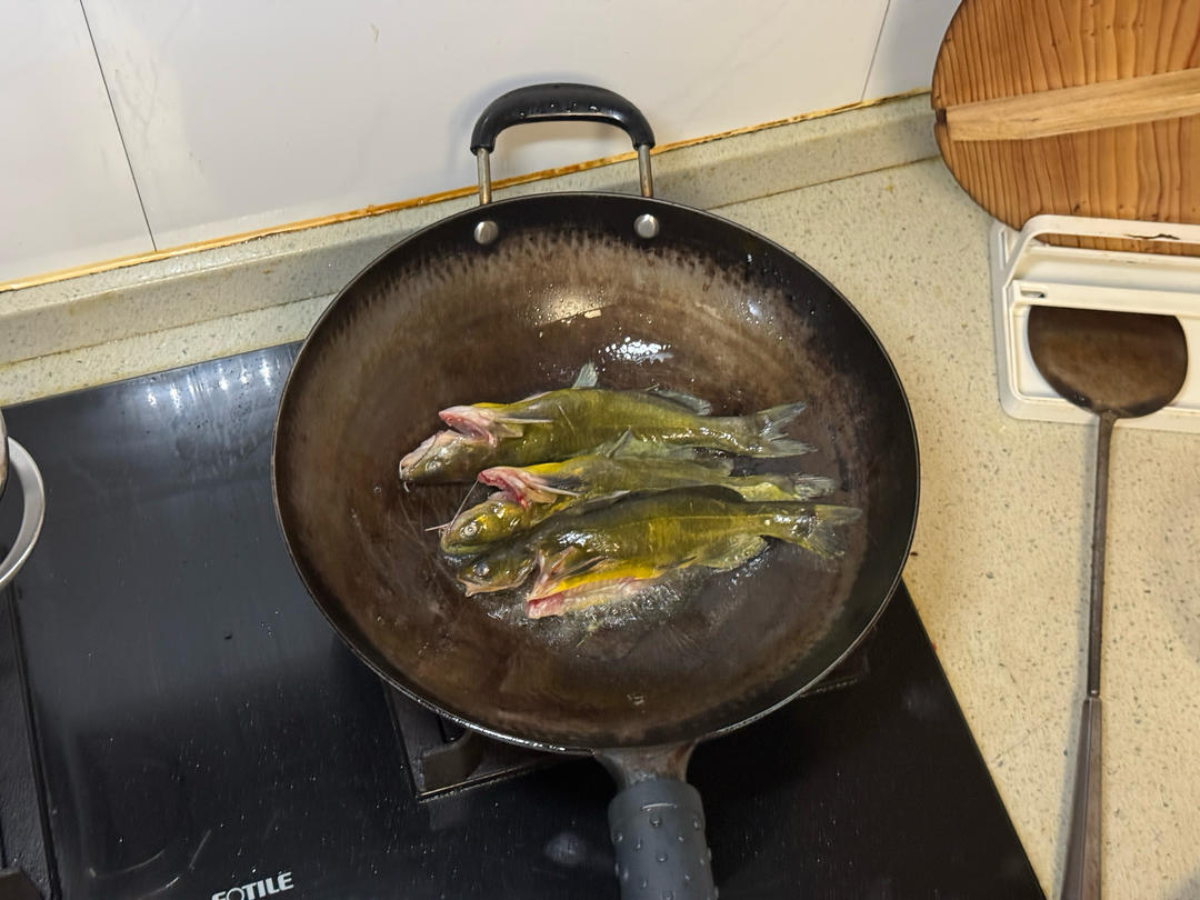 两边都煎了,可以下姜蒜,也煎一煎