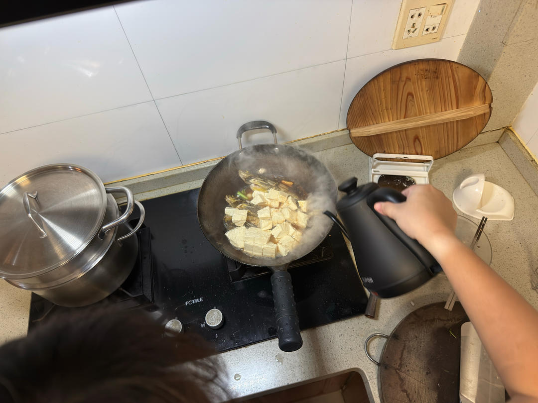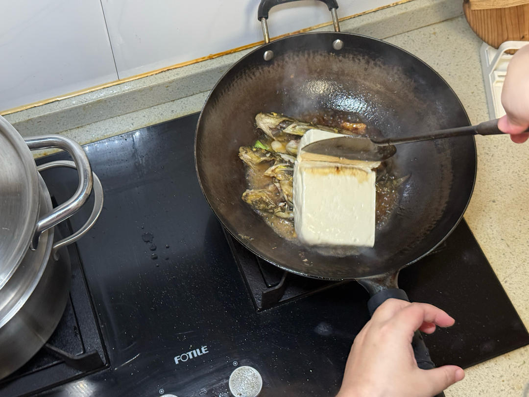 准备下鱼,可以先把火关小,低一点放鱼,放好再把火恢复中火。 煎鱼,先不要翻动,可以用手调整锅的角度,让鱼的不同部位都能被均匀煎到。 过程中站的离锅稍微远一点,或者左手用锅盖当盾牌挡一下,防止油爆。 煎几分钟后,用手晃动锅,让鱼松动脱离锅底,然后用锅铲把鱼翻面,或者用筷子帮忙。鱼被煎过后有点变形,会比较难翻。还要小心油飞溅。