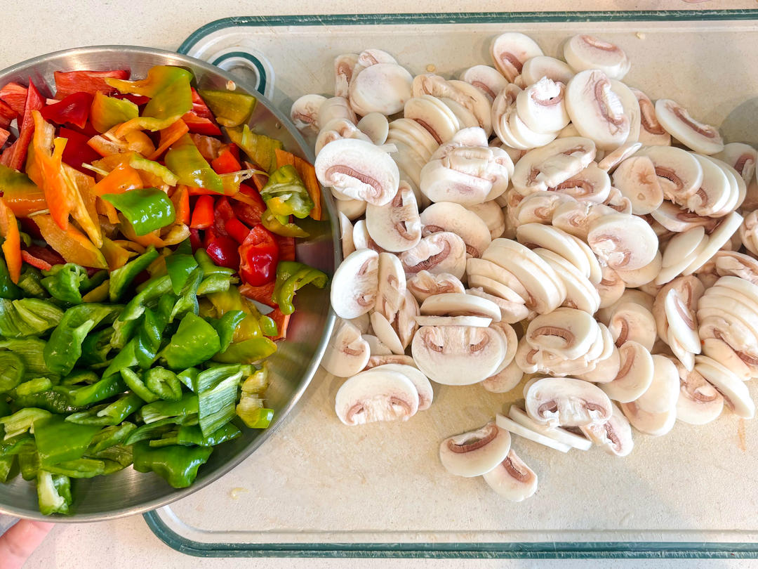 口蘑切片,辣椒切段备用。