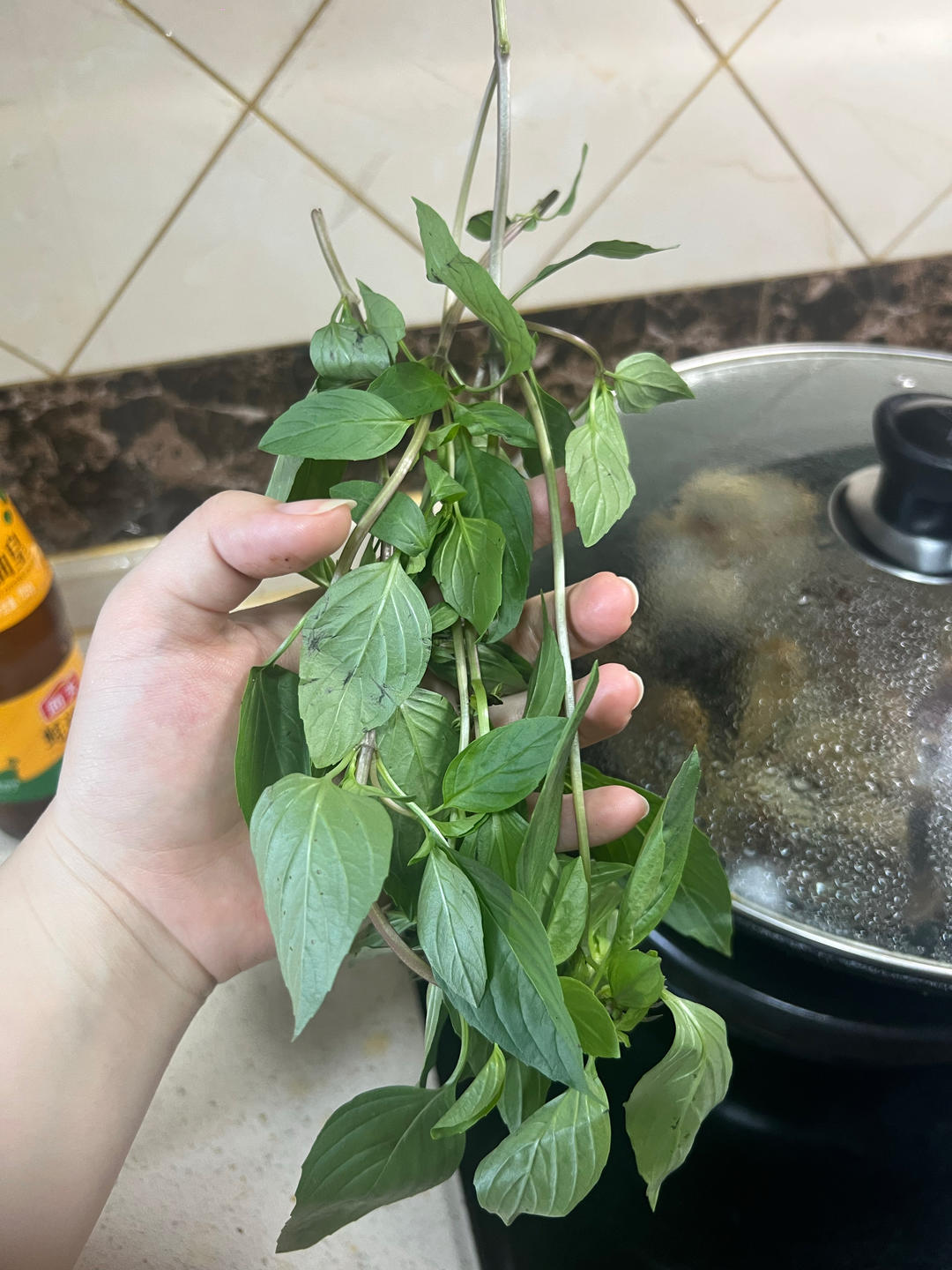 放入葱花/或者九层塔焖1-2分钟。我比较爱九层塔,不喜欢的这步骤可以完全忽略!放葱花也很好吃。或者不放也很好吃!
