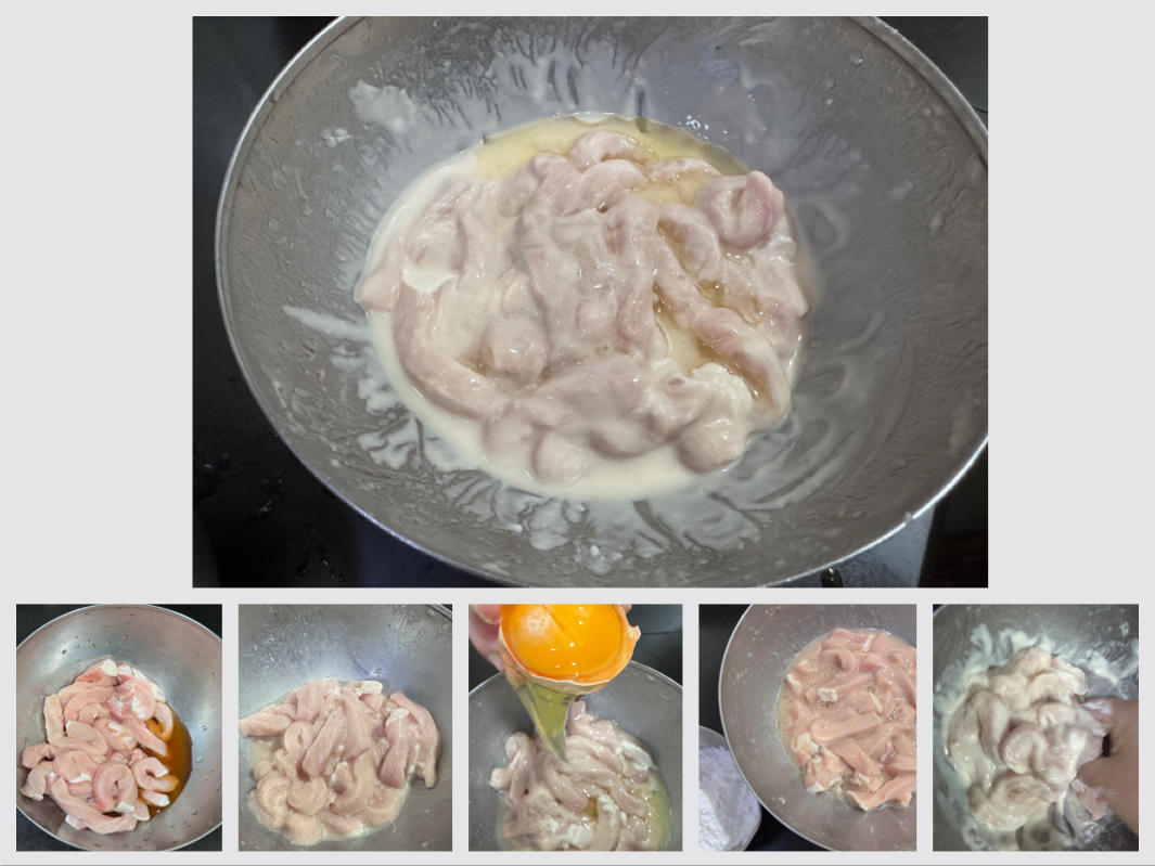 1)➕鸡粉1勺➕盐1勺➕料酒1大勺➕麻油少许抓捏 2)葱姜水(少量多次加入)抓捏 3)➕1个蛋清或者全蛋都可以,抓捏均匀 4)➕半碗土豆淀粉抓捏上浆(挂浆可以再厚一点,不要有水) 5)➕油,封