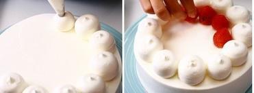 用圆形花嘴(大约1cm直径)装入裱花袋,再装上奶油,在蛋糕顶部的周围,挤一圈大一点的(约直径3.5-4cm)的圆球,内层码放一层草莓,中心部分撒点黑巧克力碎,最后顶部撒点糖粉、底部边缘撒点椰丝做装饰