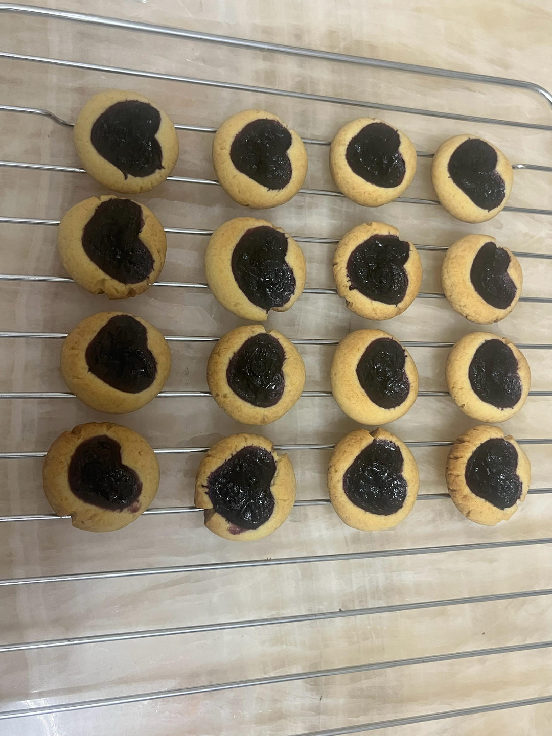 来交作业了,21片,用了50克蓝莓果酱,上火180℃,下火170℃,20分钟。下火有点偏高,下次改为160℃。